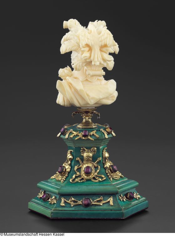 Material / Technik: Elfenbein, geschnitzt, poliert; Sockel: Elfenbein, grün eingefärbt; Silber, getrieben, vergoldet; Edelsteine (Diamanten, Rubine?)