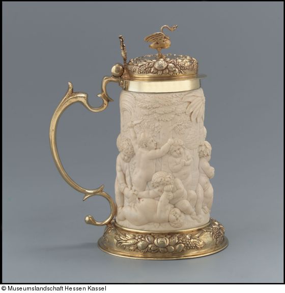 Nach der mittelalterlichen Blüte künstlerischer Elfenbeinschnitzerei erlebte diese zu Beginn des 17. Jhs. eine Wiederbelebung und löste die zwischenzeitlich bevorzugten Kleinbronzen der Renaissance ab. Die zylindrische Form der in großen Mengen eingeführten Elefantenzähne eignete sich besonders für Deckelhumpen.